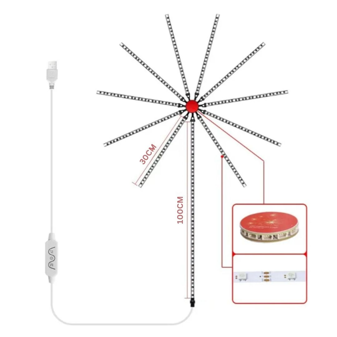 Diseño: efecto fuego artificial con 10 tiras de 30 cm + 1 tira central de 100 cm