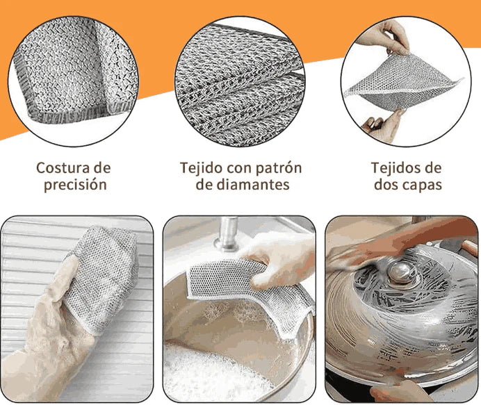 Estos paños de acero inoxidable están diseñados para remover suciedad adherida sin dañar tus superficies, incluso en las áreas más exigentes de la cocina.